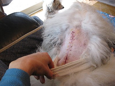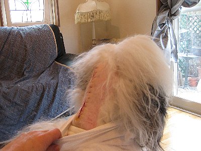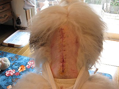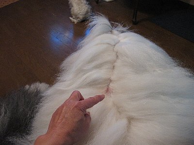 慌てて毛を分け指でまさぐる===頭の後ろ、首の中央に大きなシコリが!