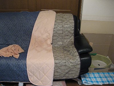 *「念のため」3ワンsを二階で寝かせ、エアコンもつけ、「万が一」のためにマットやタオルなどをソファと床に置いて就寝。